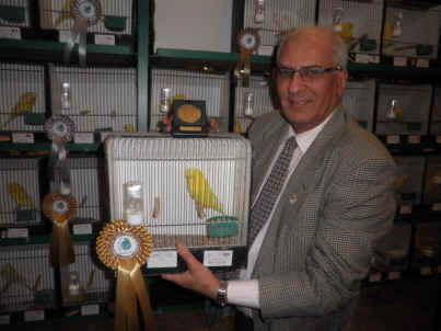 ![]() Ghalib Al-Nasser with his gold medal for Best Lutino budgerigar |